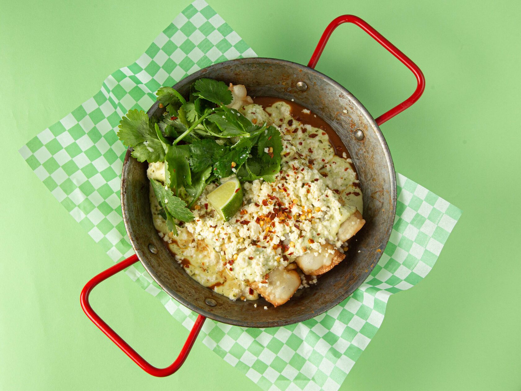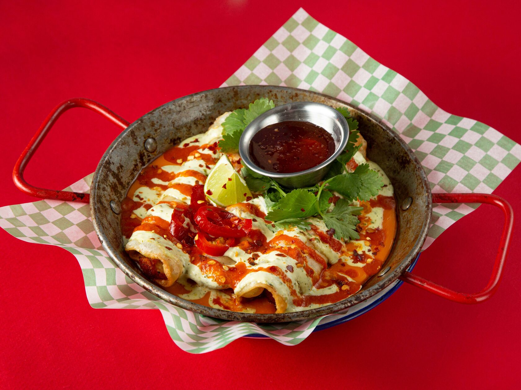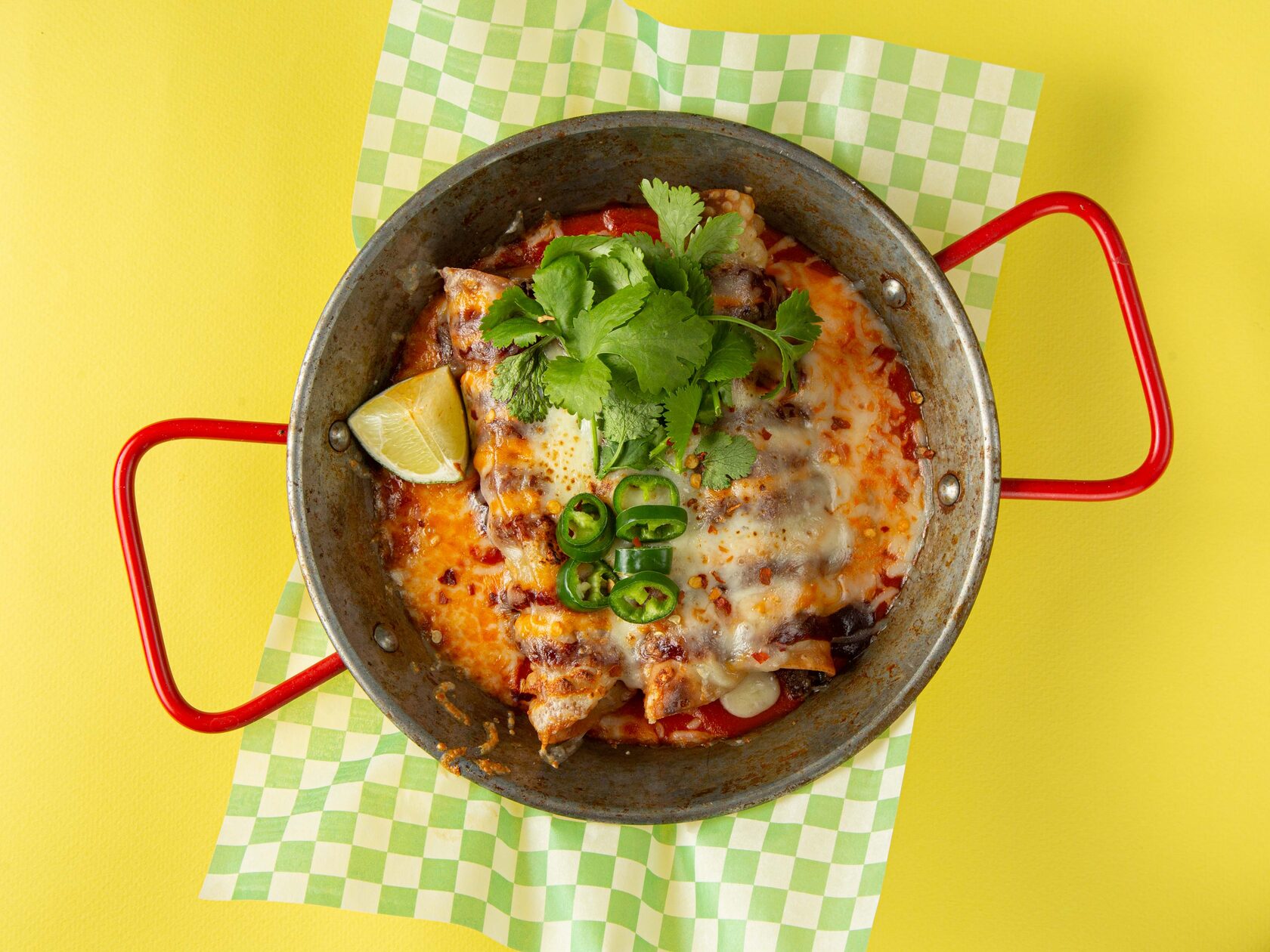 Энчилада с брискетом и карамелизированным луком, в сырной шапке